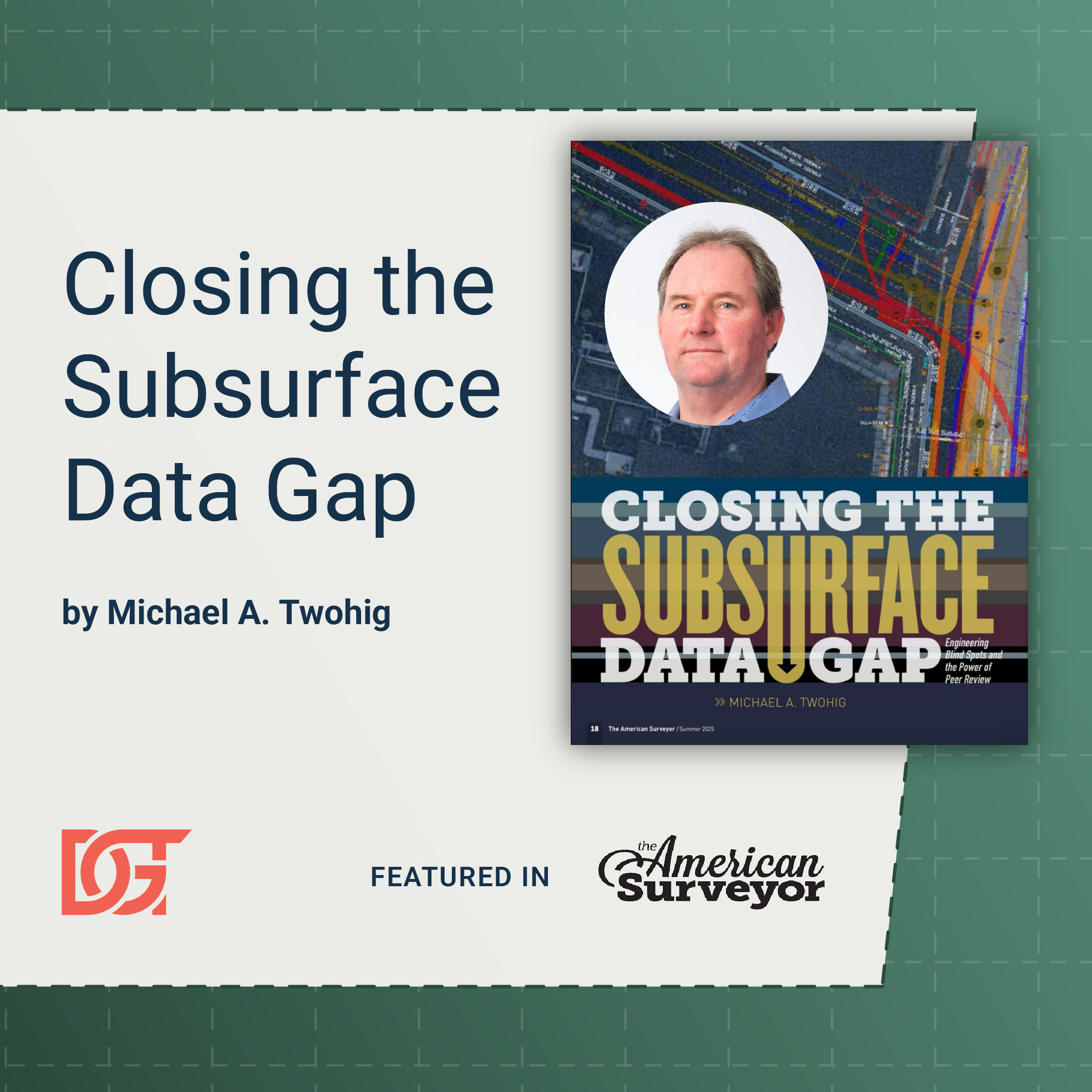 An article written by Michael Twohig was recently featured in American Surveyor Magazine. His piece, “Closing the Subsurface Data Gap: Engineering Blind Spots and the Power of Peer Review,” highlights the importance of including subsurface utility experts in engineering peer reviews. Bringing SUE/SUM specialists into the process early strengthens cross-disciplinary collaboration, ensuring underground utility data is accurately interpreted and fully integrated into design decisions.